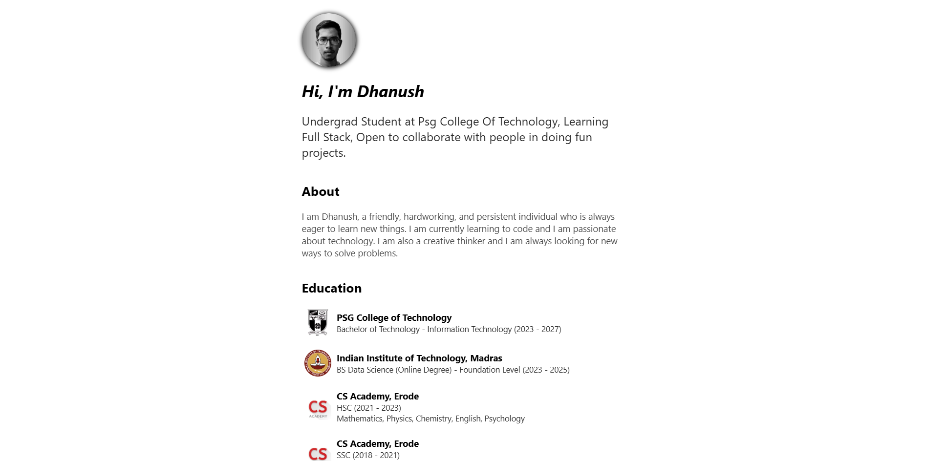 I am Dhanush, a friendly, hardworking, and persistent individual who is always eager to learn new things. I am currently learning to code and I am passionate about technology. I am also a creative thinker and I am always looking for new ways to solve problems.